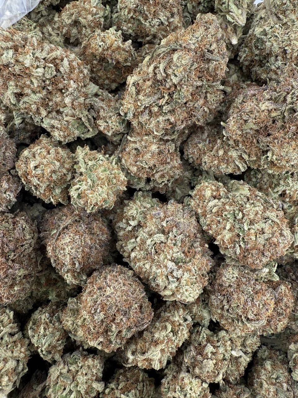 - Heavy trichome frosting giving a white, crystalline appearance
