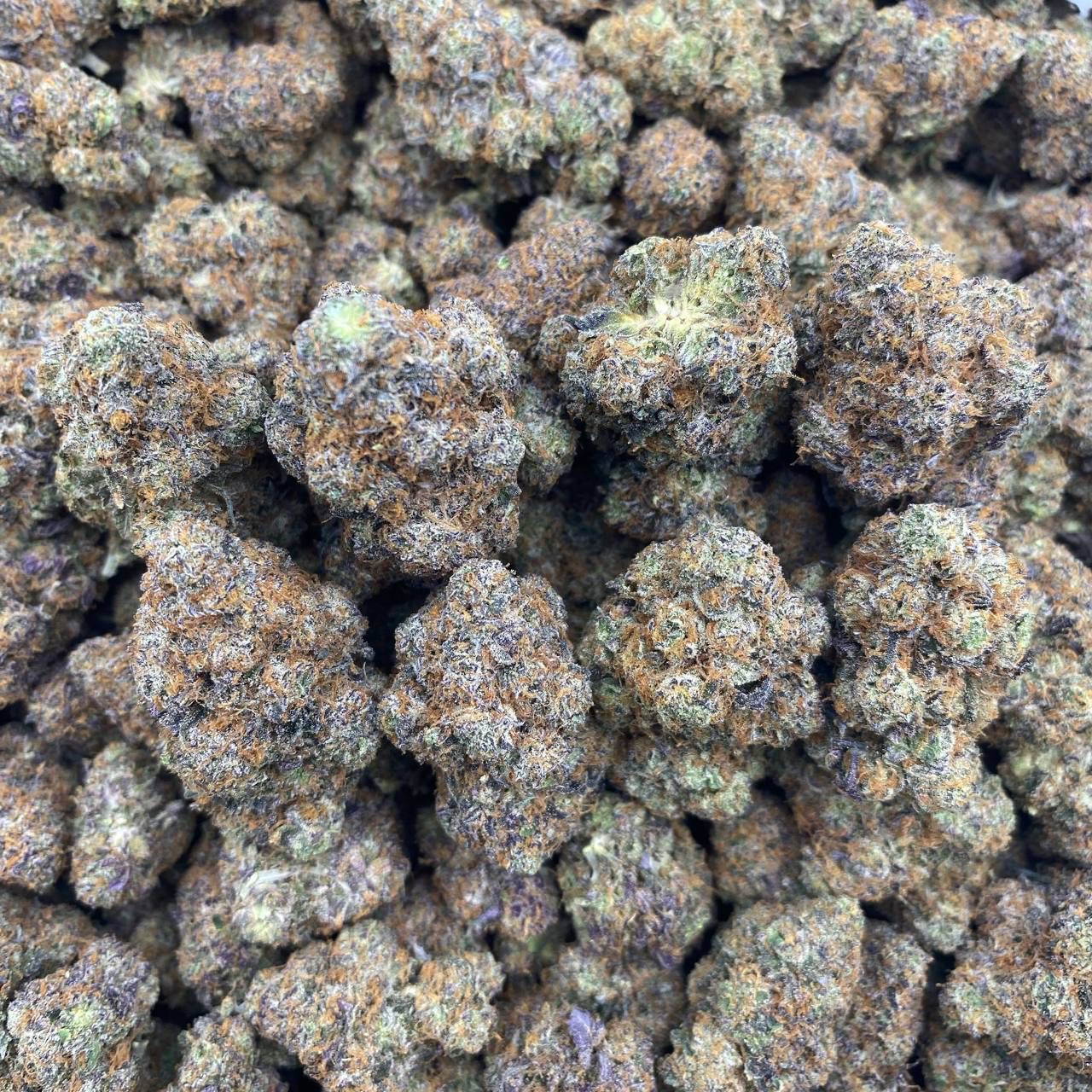 Dark, colorful buds with heavy trichomes.