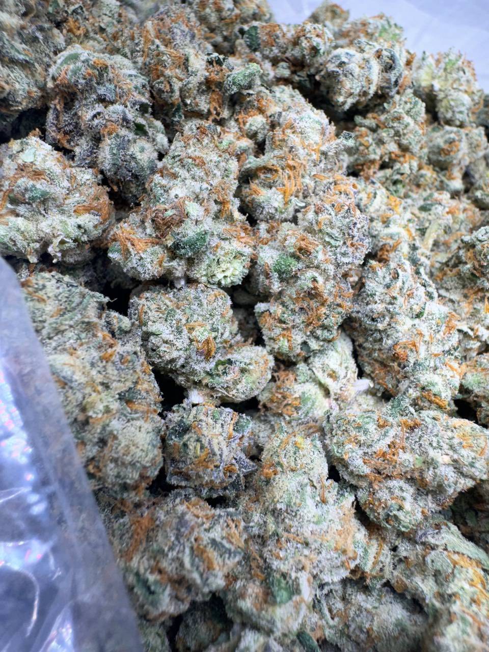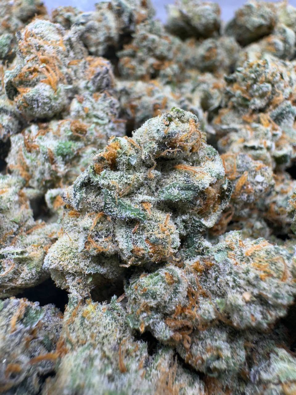 - A heavy coating of frosty trichomes that sparkle under light